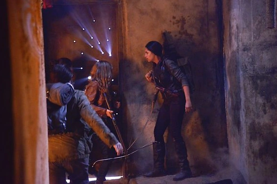 Luego Charlie se encuentra atada a una silla. Kinsey le apunta con una ballesta atada a un hilo, que se accionará cuando alguien abra la puerta. Kinsey sale de la abitación, y es abatido por Miles. Cuando entran a la habitación donde esta Charlie, ella logra inclinarse y se salva del impacto.